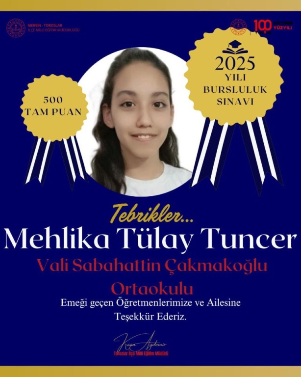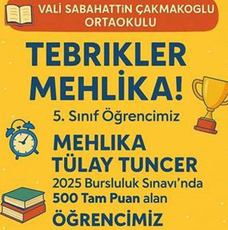5.Sınıf Öğrencimiz Mehlika Tülay Tuncer 2025 Bursluluk Sınavında 500 Tam Puan Alarak Türkiye Birincilerinden Olmuştur.